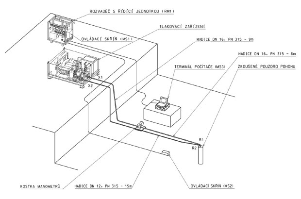 po dobu 10 min., lineárního poklesu tlaku na tlak zkoušky těsnosti s rychlostí 1MPa/min. a zkoušky těsnosti. Řídicí systém umožňuje provádět zkoušky buď v plně automatizovaném režimu (zahrnuje zavodnění zkoušeného objektu, provedení vlastní tlakové zkoušky, odvodnění zkoušeného objektu) nebo