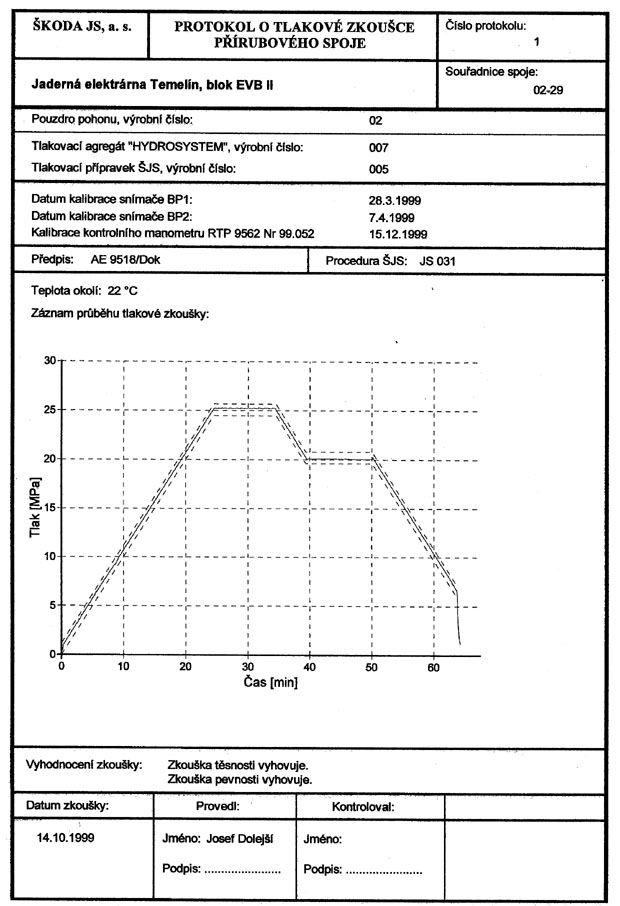 Zkouška těsnicího spoje se provádí podle interního předpisu pro jaderné elektrárny a spočívá v lineárním nárůstu tlaku s rychlostí 1MPa/min. na tlak zkoušky pevnosti, prodlevě na tlaku zkoušky pevnosti