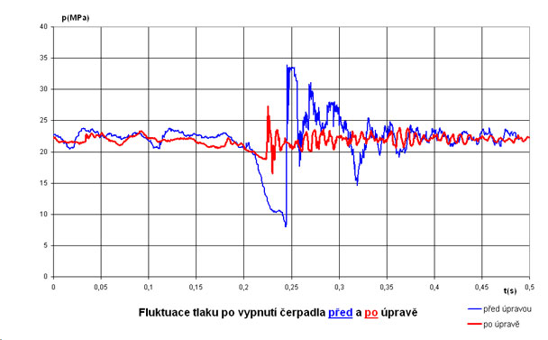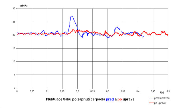 Po výpočtové analýze a změření časových průběhů hydraulických veličin na vhodně zvolených místech čerpací stanice byly navrženy a provedeny úpravy na stávajícím sacím i výtlačném potrubí. Současně byly na vybraných místech potrubního systému umístěny speciální tlumiče tlakových rázů. Účinnost těchto úprav je zřejmá z obrázků, na kterých jsou vykresleny průběhy dynamické složky tlaku (statická složka tlaku je 22 MPa) před provedenými úpravami a po nich, a to ze stejného měřicího místa.