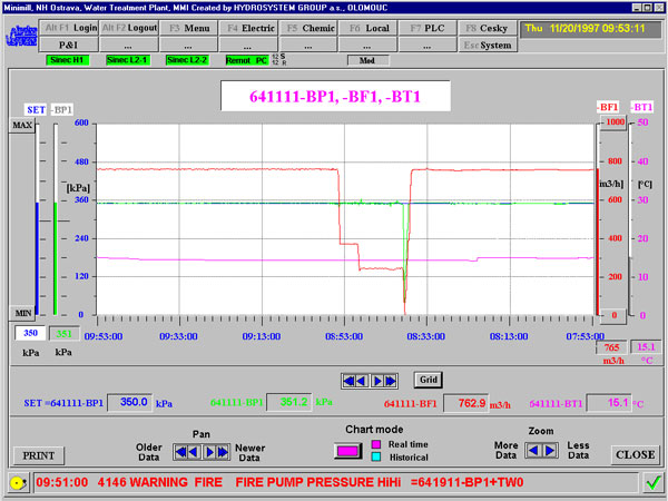 V části SKŘ se jednalo o prověření funkčnosti řídícího systému vodního hospodářství a licího stroje, zejména pak o propojení úrovně řízení 1 na úroveň 2, přenos signálů a dat mezi jednotlivými úrovněmi, funkčnost a náběh havarijního chladicího systému. Některé výsledky testů jsou uvedeny na obrázku č. 2, kde je zachycen průběh tlaku, průtoku a teploty v závislosti na čase při simulovaných záskocích hlavních čerpadel přímého chlazení.